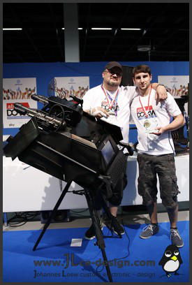 The Titan Task ForceDieser Casemod zählt ebenfalls zu den 24 Stunden Mods von Ali Abbas und mir. Grundlage dieses Casemods ist nicht nur das Case selber, sondern auch eine Schubkarre. Diese bildet das Grundgerüst des Mods. Der Casemod steht auf einem Dreibein, welches durch ein Gelenk mit dem Casemod verbunden ist. Auf diese Weise lässt sich das Case in alle Richtungen neigen. Über Bewegungssensoren erfasst dabei der Computer die Neigungslage. Der Hintergrund: In dem Casemod ist auch ein Bildschirm eingelassen, über diesem man ein Spiel spielen kann. Die Neigunssensoren erkennen die Richtung, in die das Flugzeug im Spiel fliegen soll. Man lenkt also mit der Neigung des gesamten Casemods das Flugzeug im Spiel!